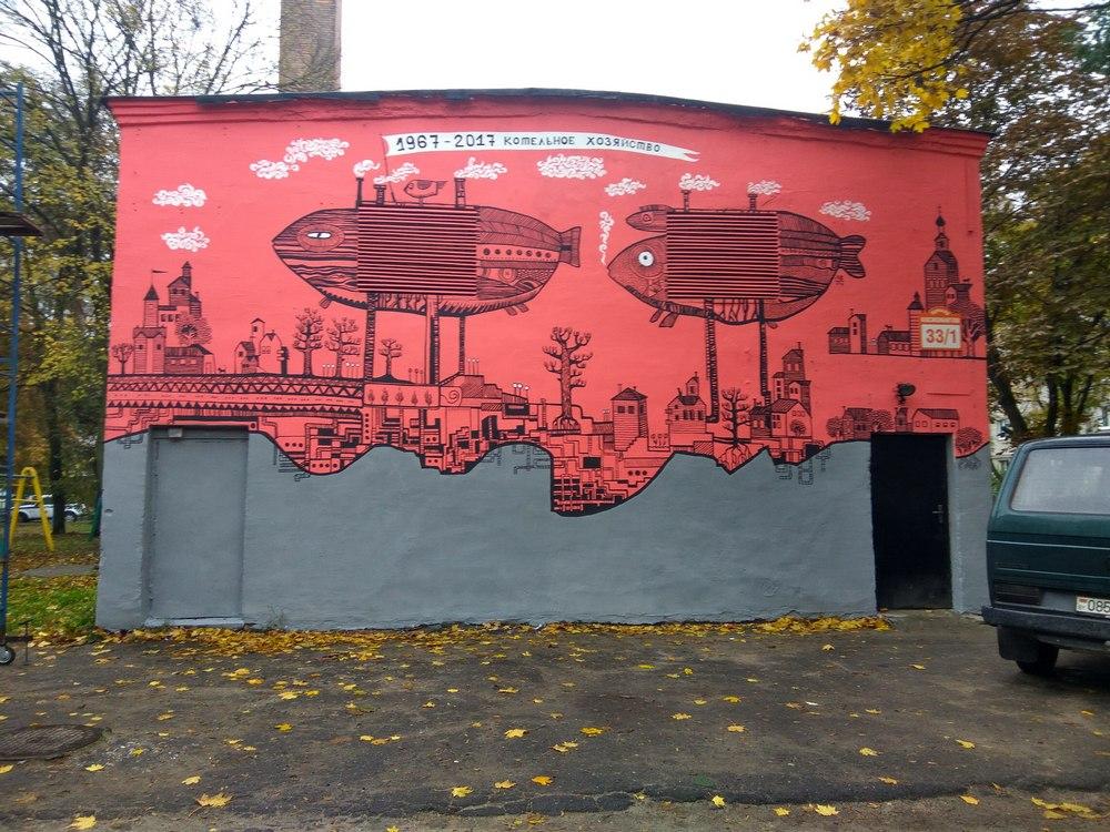 Граффити на центральных тепловых пунктах появились по заказу котельного хозяйства. На прошлой неделе была завершена работа на ул. Пушкинской. На красном фоне художница изобразила рыб-дирижаблей. На создание граффити ушло три недели.