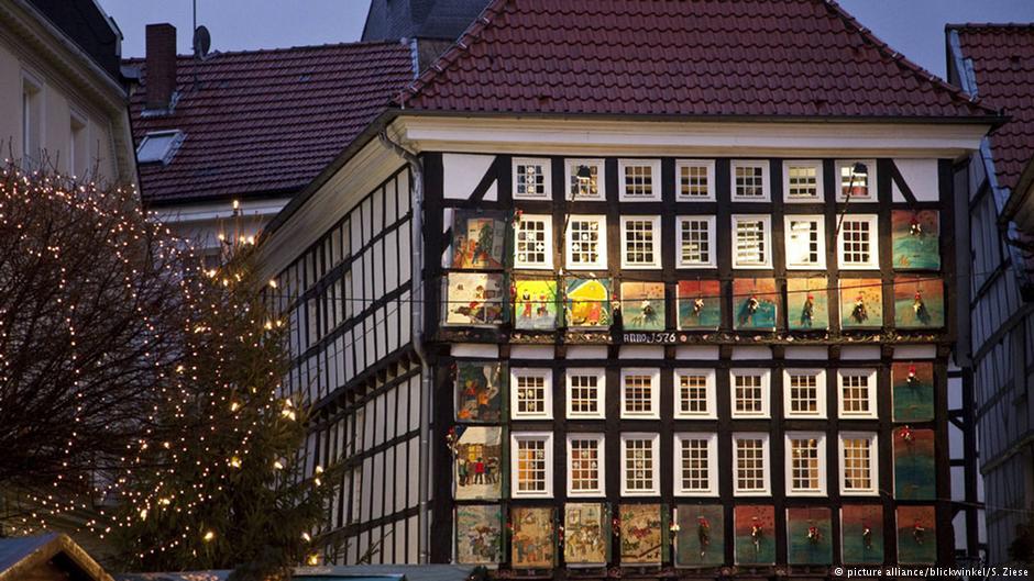 В самый большой рождественский календарь в Германии превращается старая ратуша в историческом центре немецкого города Хаттингена в Рурской области. Новое окошко этого календаря открывается каждый день в 17 часов. Здание, предназначавшееся для городского мясного рынка, было заложено в начале XV века, а два этажа для ратуши надстроили здесь в 1576 году.