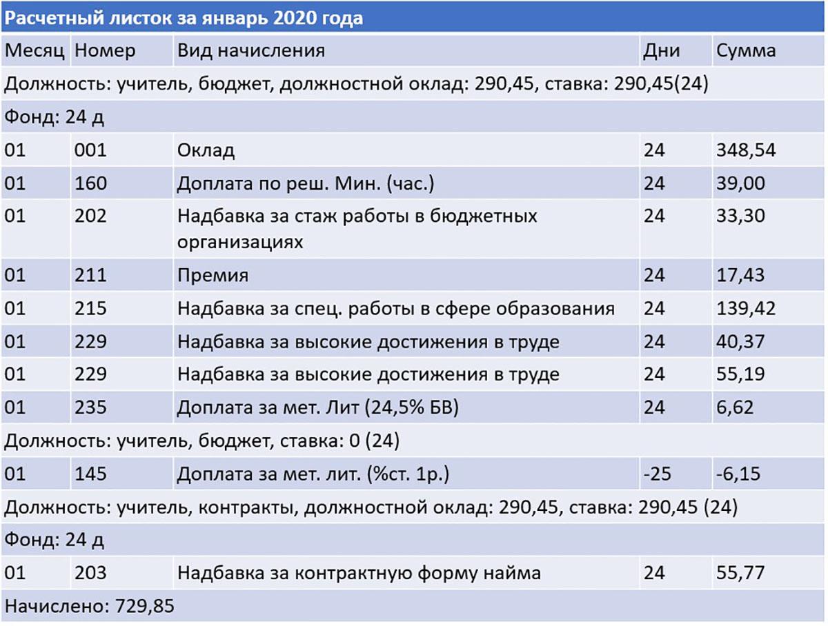 Расчетники работников образования подтверждают, что в январе они получили зарплаты значительно ниже, чем в ноябре и декабре прошлого года. К примеру, учитель высшей квалификационной категории с 32-летним педагогическим стажем суммы в ноябре за 25 дней получил 1 351,28 рубля, в декабре за 25 дней — 1 470,99 рубля, а в январе — 1 176,46 рубля. Правда, в январе на один день он отработал меньше. Разница в суммах с ноябрем составила 174,82 рубля, а с декабрем — 294,53 рубля.