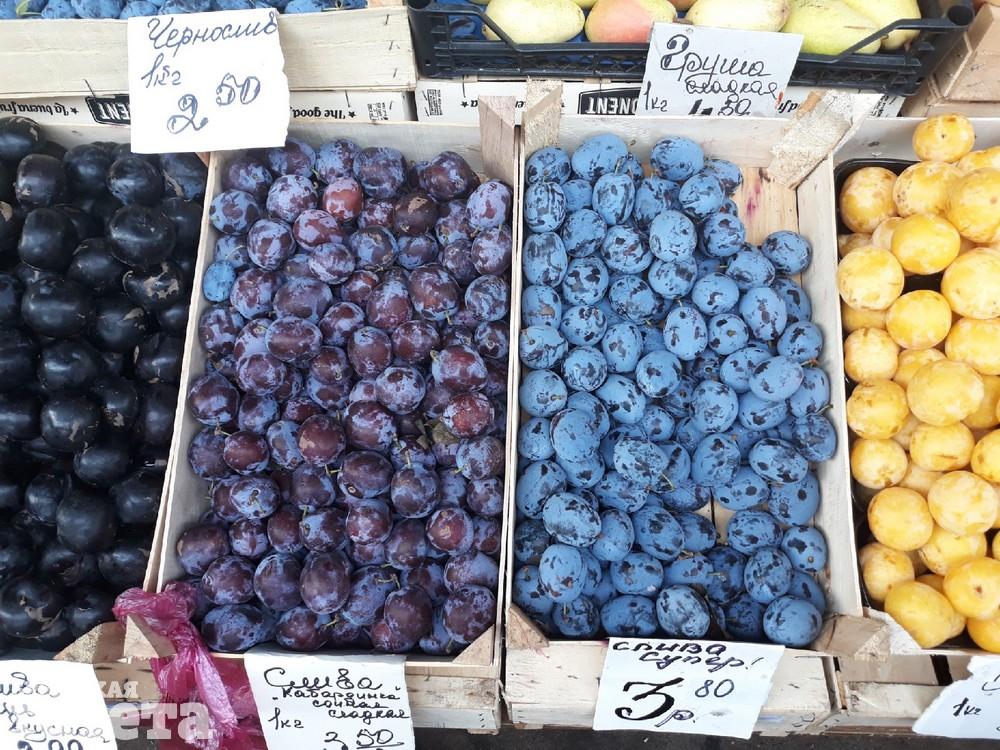 В сезоне продаж на рынке сейчас дыни (1,70 – 2) и арбузы (0,80 – 1). Много на рынке видов винограда (от 3 до 4,5 рублей) и слив (от 2 до 6).