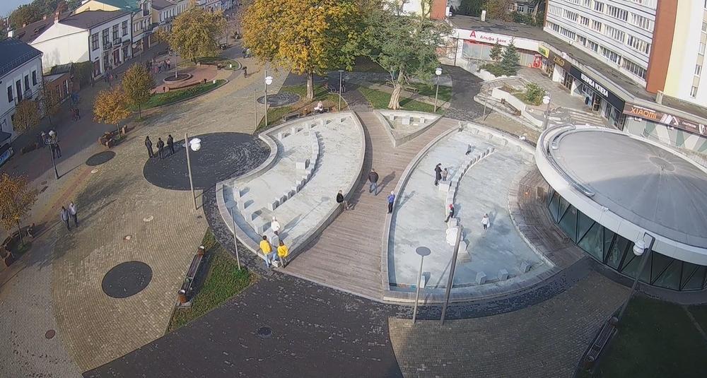 Возле фонтана на улице Советской в Бресте, который часто был точкой сбора протестующих, в 13.45 скопления людей не наблюдалось. Зато, судя по камере, прямо в центре улицы уже довольно долго стоят три сотрудника милиции. На Гоголя возле памятника Тысячелетию стоит три тонированных буса.