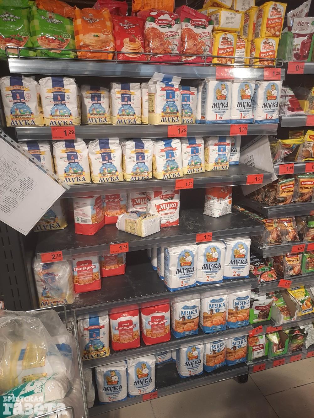В понедельник 16 марта корреспондент «БГ» прошлась по ближайшим к редакции продуктовым магазинам, чтобы посмотреть, есть ли ажиотаж в брестских магазинах, ведь люди поговаривают, что спрос на долго хранящиеся крупы, муку, консервы и даже туалетную бумагу вырос, а полки с этими категориями товаров потихоньку пустеют.