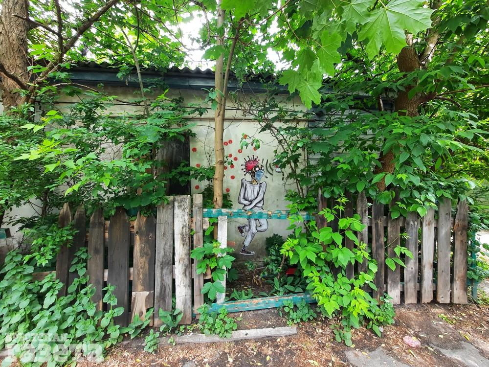 На одном из старых жилых домов, который находится за зданием Почетного консульства Франции в Бресте по адресу улице Гоголя, 46, можно увидеть стрит-арт на тему влияния коронавируса на общество. На рисунке изображен человек в смирительной рубашке и маске, смартфон и иллюстративные молекулы коронавируса.