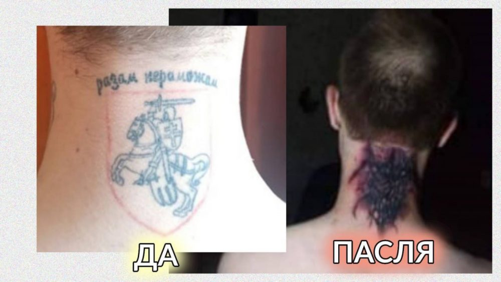 Силовики заставили жителя Каменца Сергея избавиться от татуировки «Погоня» на шее и нескольких татуировок с текстом «АСАВ». Провластный телеграм-канал опубликовал фото, на котором видно, что все тату (в том числе «Погоня») перебиты новыми татуировками поверх. В своем комментарии силовики отметили, что парень сделал это сразу же после ИВС.