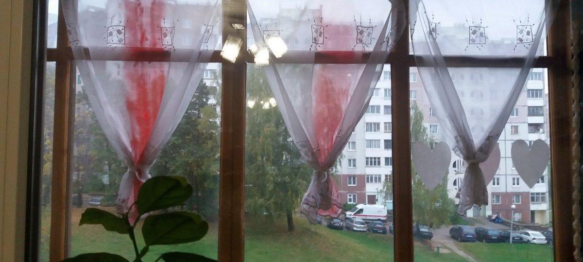 Сотрудники спросили, что случилось. Отец Ольги, по ее словам, сказал прямо: «Вот, моя семья здесь вывесила флаги». Хотя, подчеркивает женщина, это нельзя назвать флагами: обычные белые занавески с нарисованными от руки красными полосочками.