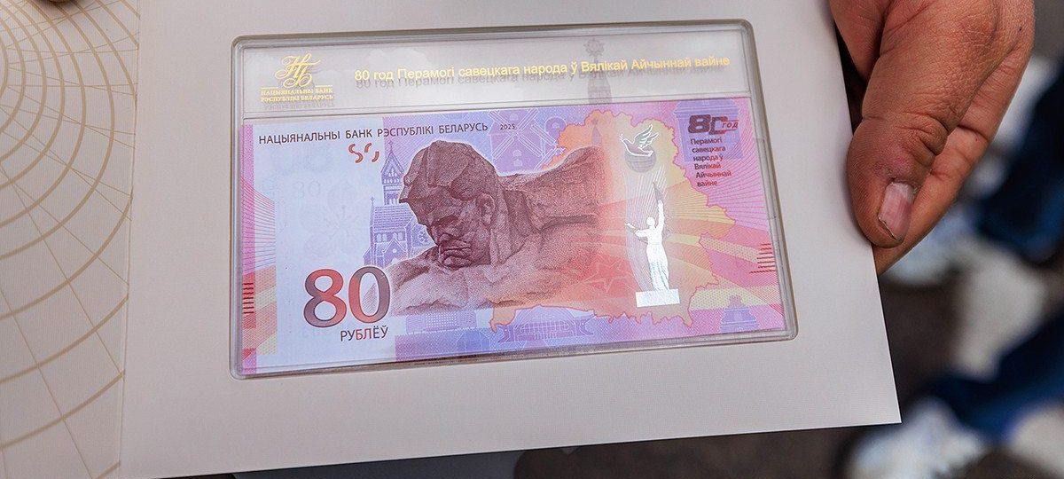 Центральный элемент выпуска — 80-рублевая банкнота. На лицевой стороне изображены знаковые памятники: монумент «Мужество» Брестской крепости, скульптура «Родина-мать», архитектурные символы страны. На обороте — «Ворота Минска», аисты, цветок яблони и трогательная сцена с рукой матери и ребенка. Идея — объединить память, национальный колорит и образ будущего.