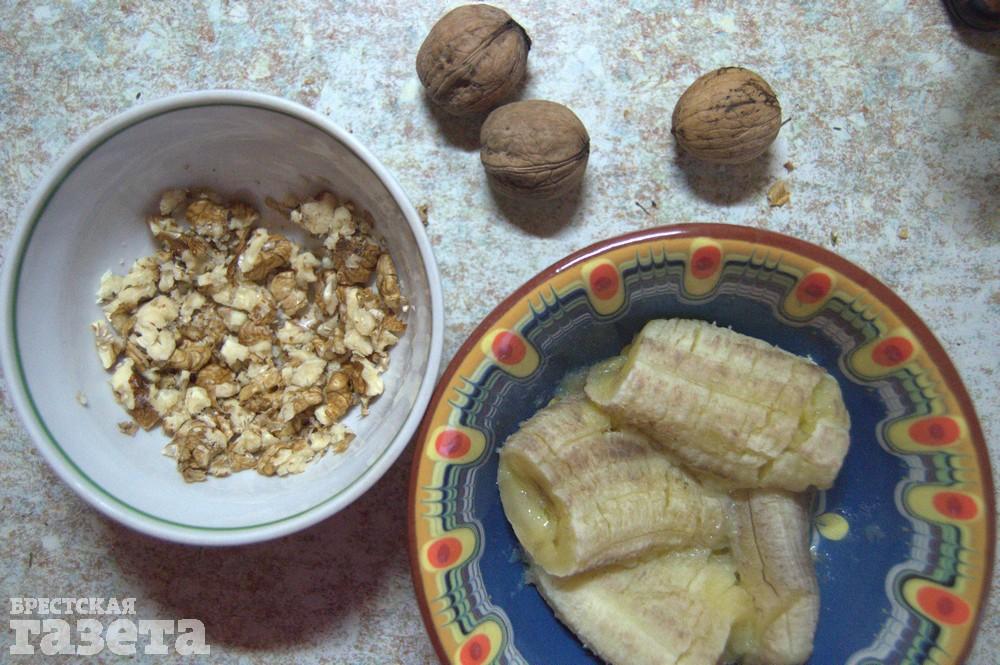 Пока готовится банан, очистите грецкие орехи и немного размельчите их при помощи ступки.