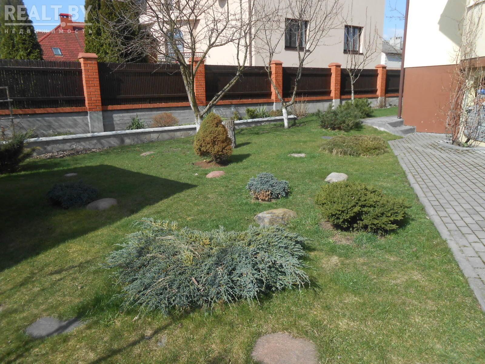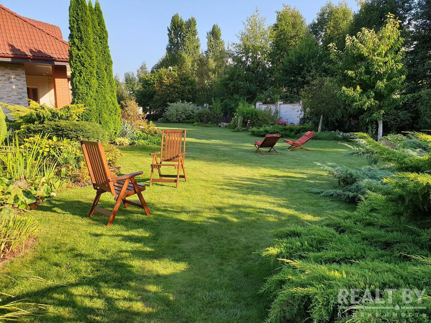 На территории имеется гараж на три машины, беседка, высажен фруктовый сад и даже упоминается, что есть ландшафтный дизайн.