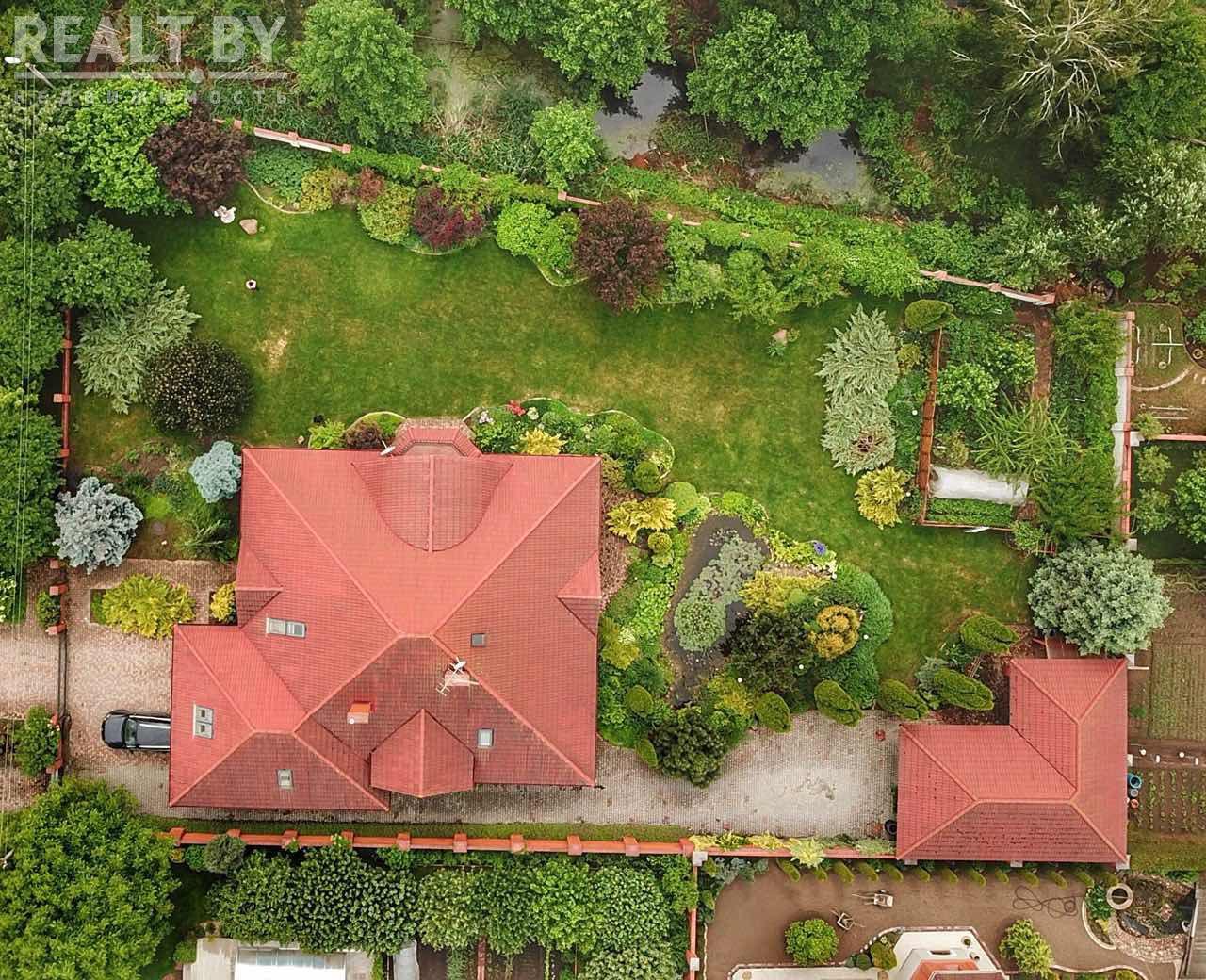 На территории есть водоем, беседка с барбекю, а также два гаража — один встроенный на 2 автомобиля, другой — отдельно стоящий также на две машины.