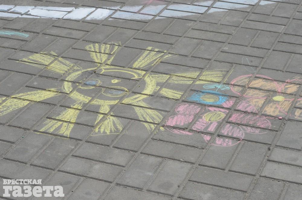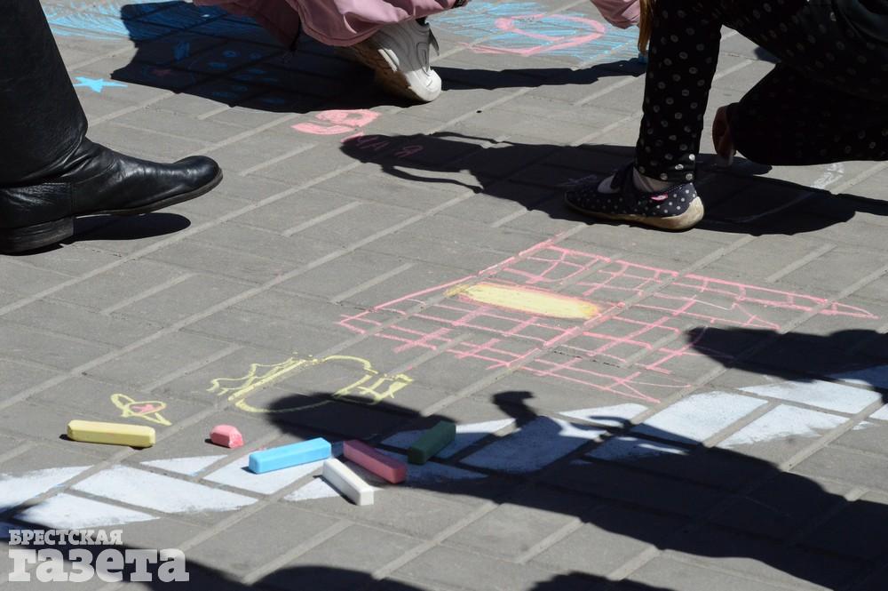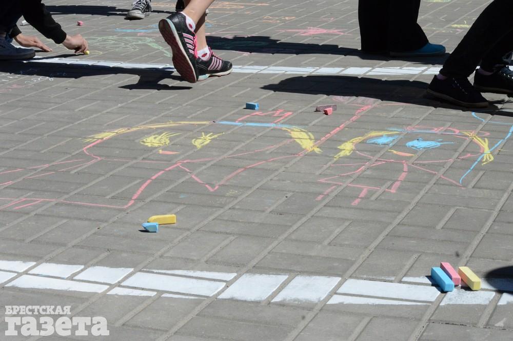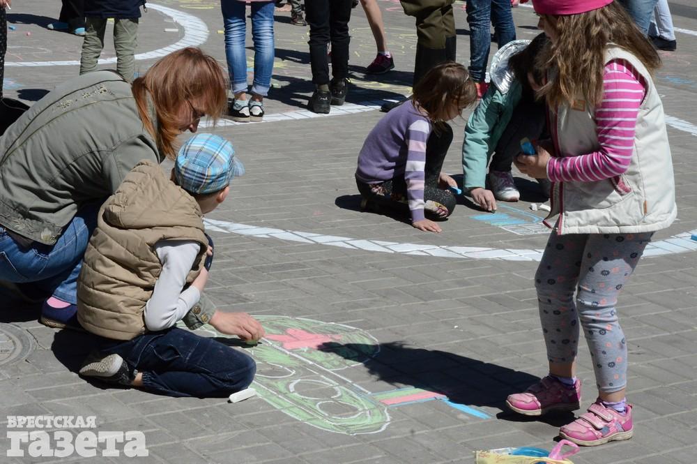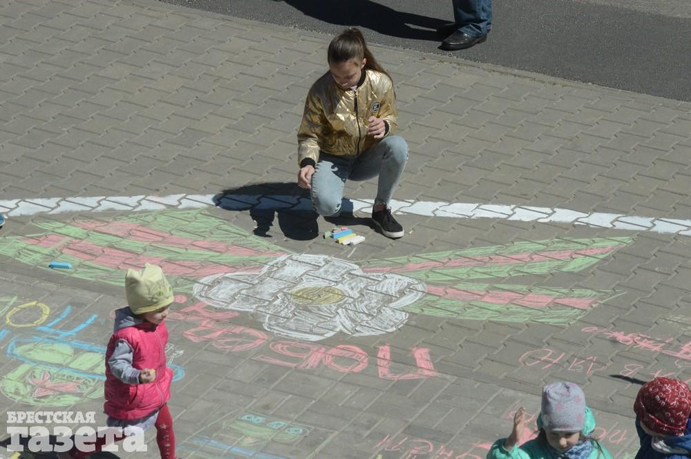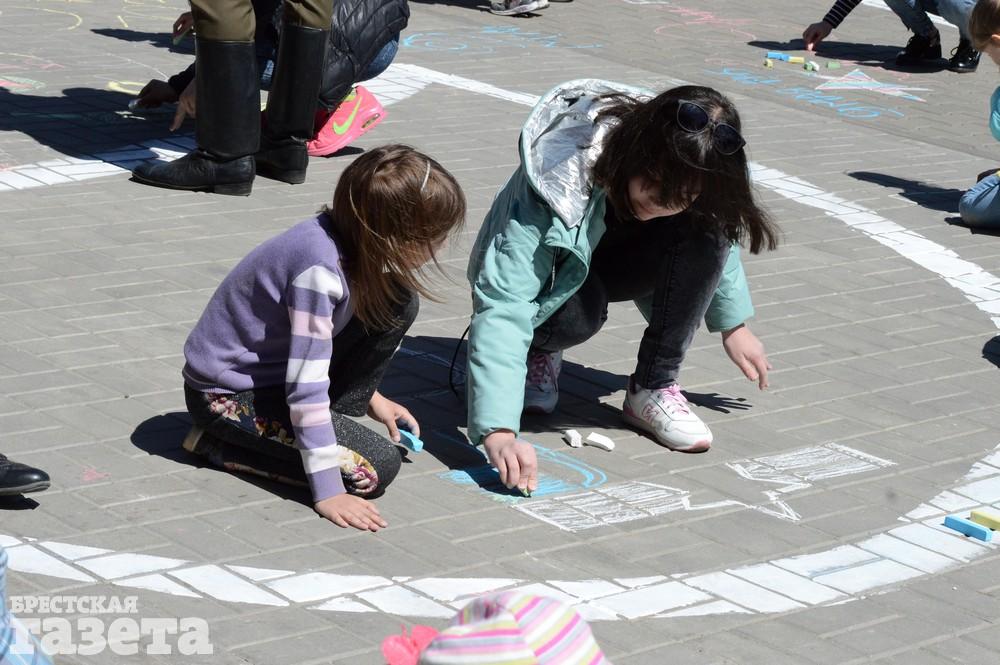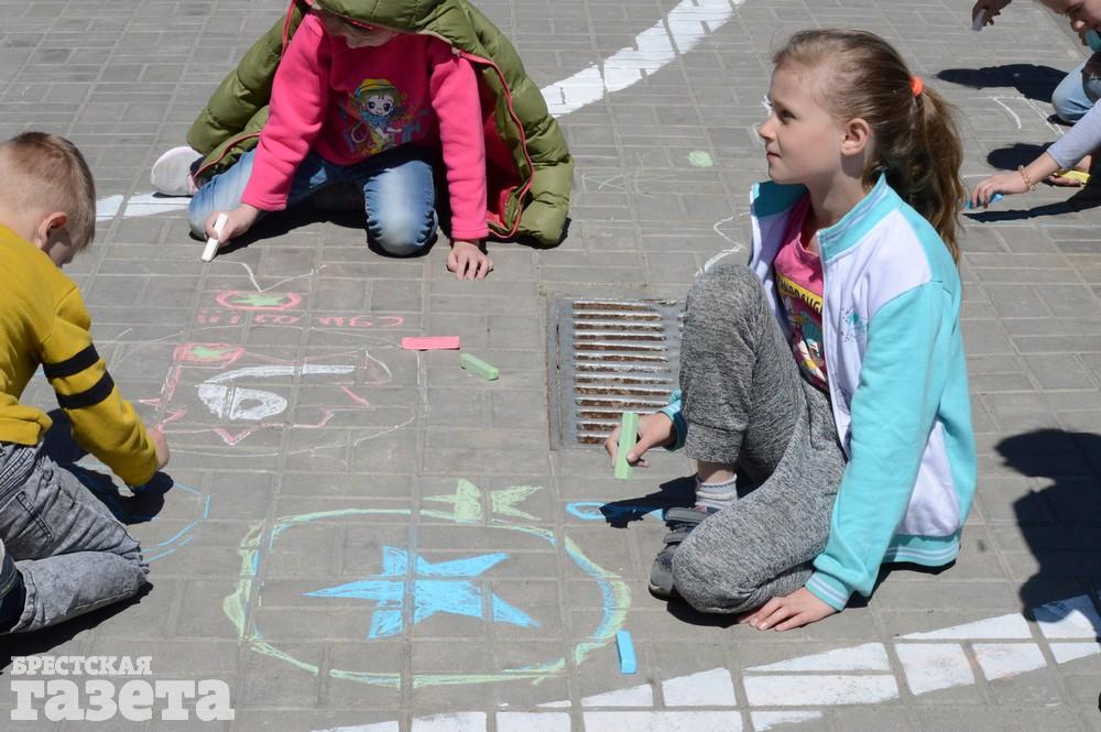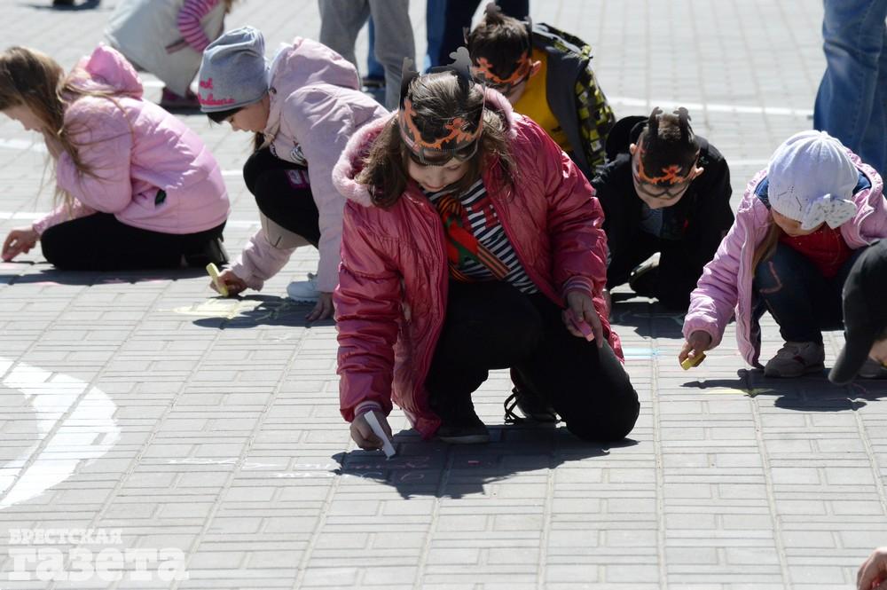 Дети рисовали мелками на тротуаре в центре большой девятки. Кто-то изображал танки, кто-то Брестскую крепость. Другие рисовали цветы и мирное небо, солнце. Участники флешмоба получали сладкие призы за свое творчество, фотографировались и бегали на площадке перед торговым центром под военную музыку.
