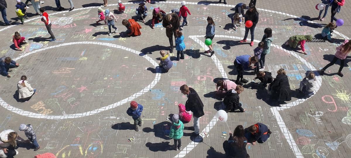Детские рисунки заполнили огромную девятку, которую заранее начертили на тротуаре организаторы флешмоба. Всю эту красоту снимут на видео с квадрокоптера и разместят впоследствии в соцсетях.