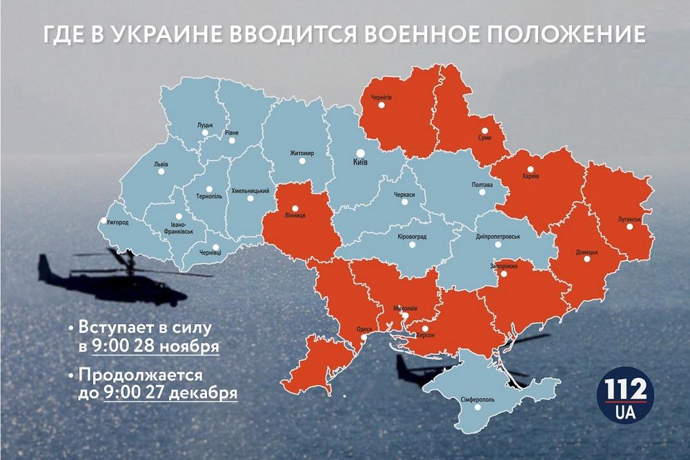 Военное положение на территории Украины вступит в силу утром 28 ноября и продлится 30 дней. Такие меры будут введены только в областях, граничащих с Россией и Приднестровьем: Винницкой, Луганской, Николаевской, Одесской, Сумской, Харьковской, Черниговской, Херсонской, Донецкой и Запорожской, а также во внутренних водах Азово-Керченского пролива.