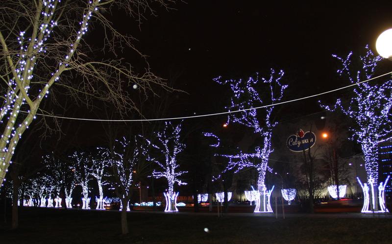 Завершает всю композицию аллея из 56 ярких светящихся деревьев по обе стороны парка. Самое большое дерево в самом «богатом» наряде расположилось у детской площадки в компании с зайцами и оленями. Длина гирлянды, использованной на его украшение, — 1 км 200 м!