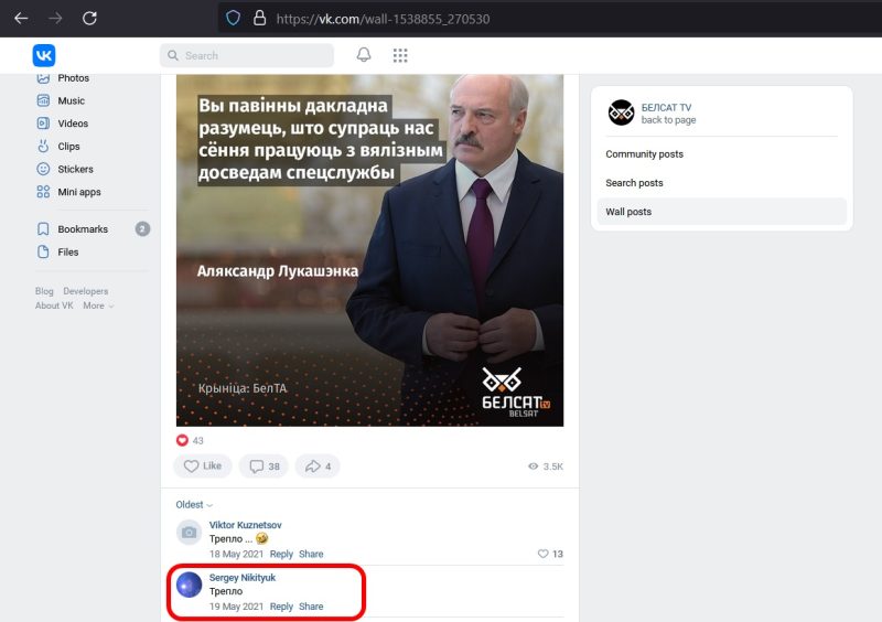 Первый пункт обвинения гласит, что 19 мая 2021 года в соцсети «ВКонтакте» в группе «БЕЛСАТ TV» Сергей оставил комментарий под новостью об Александре Лукашенко. Комментарий состоит только из одного слова «трепло». Написан под новостью с цитатой Лукашенко о том, что «против нас сегодня работают спецслужбы с огромным опытом». Этот комментарий гособвинение квалифицирует как публичное оскорбление Лукашенко по ч.1 ст.368 УК РБ.