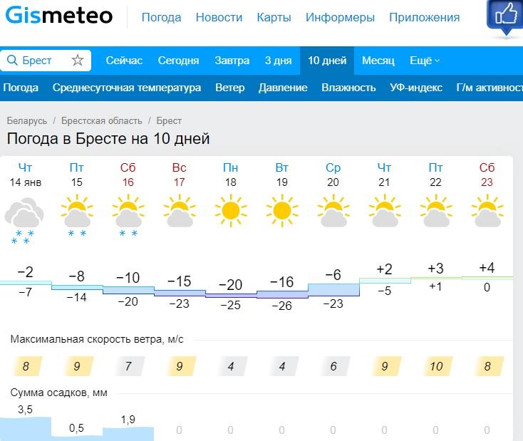 Примерно такая же погода будет в Гродно. Там в ближайшие дни температура не упадет днем даже до -20. В пятницу – -16, в субботу – -17, в воскресенье – -18. Холоднее всего будет в ночь с воскресенья на понедельник – до -27.