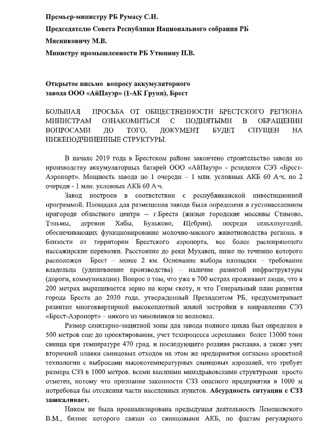 Активисты борьбы с заводом АКБ направили открытое письмо высокопоставленным чиновникам Беларуси – премьер-министру Сергею Румасу, председателю Совета Республики Национального собрания Михаилу Мясниковичу и министру промышленности Павлу Утюпину.