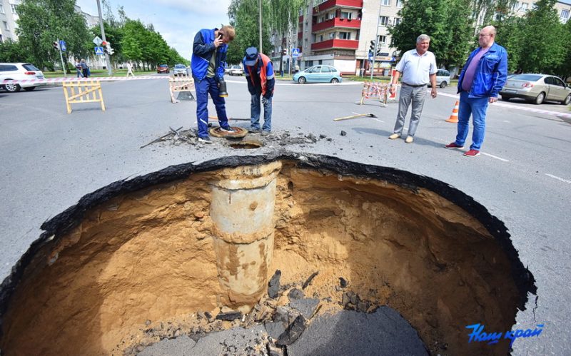 В Барановичах прямо посреди дороги открылся «портал в ад»: на перекрестке улиц Притыцкого и Коммунистической на проезжей части провалился асфальт. По предварительной информации, сильный ливень подмыл центральный канализационный коллектор. Место аварии ограждено, там работают специалисты водоканала.