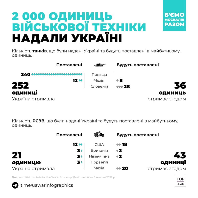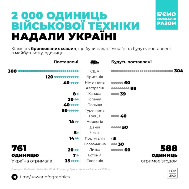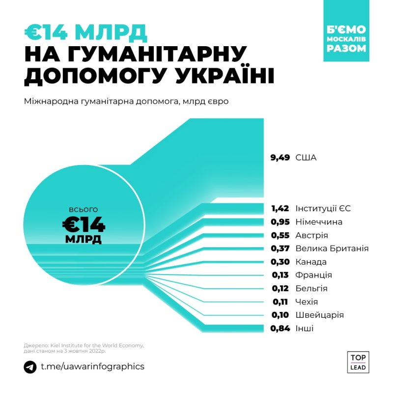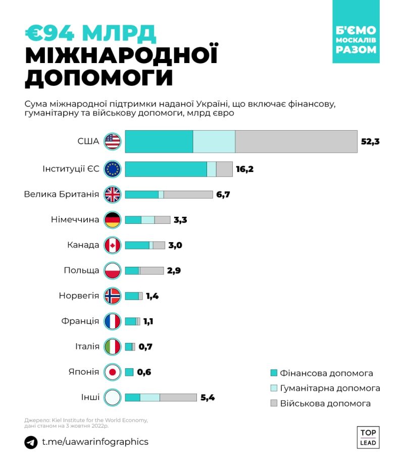 На этой войне Украина не одна — ей помогают страны, которые генерируют половину мирового ВВП. Они передают Украине технику, оружие, форму, деньги, разведданные, консультируют и обучают военных. Война идет уже девятый месяц. Контент-маркетинговое агентство Top Lead подготовило инфографику про помощь Украине во всех сферах.