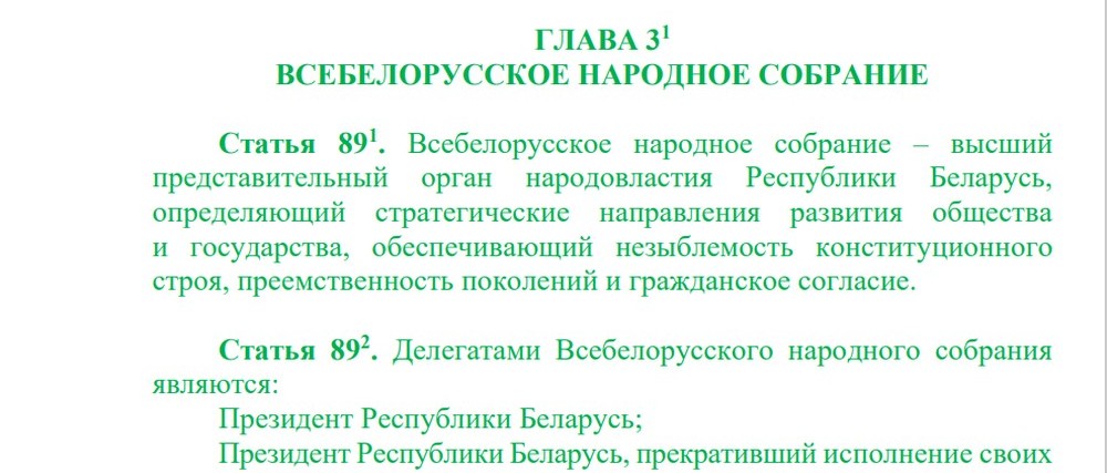 В раздел IV, который касается Президента, Всебелорусского народного собрания, парламента, правительства и судов внесено больше всего изменений. Многие статьи этого раздела полностью «зеленые», то есть новые (в проекте они прописаны зеленым шрифтом – прим. ред.). Почему столько «зелени» — нетрудно догадаться: глава посвящена системе власти. Собственно, ради нее и весь сыр-бор затевался.