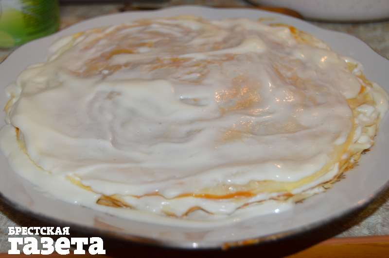 Соберите торт: каждый блинчик пропитайте начинкой — один блин сметаной, следующий сгущенкой.