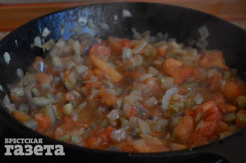 Спассеруйте на оливковом масле лук, добавьте болгарский перец и готовьте 5 минут. Добавьте томаты, по 0,5 ч. л. соли и сахара, молотый перец и потушите 10 минут.