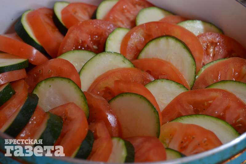 Соус положите на дно формы для запекания. Оставшиеся помидоры и цукини нарежьте кружочкамии и, чередуя, выложите на соус.