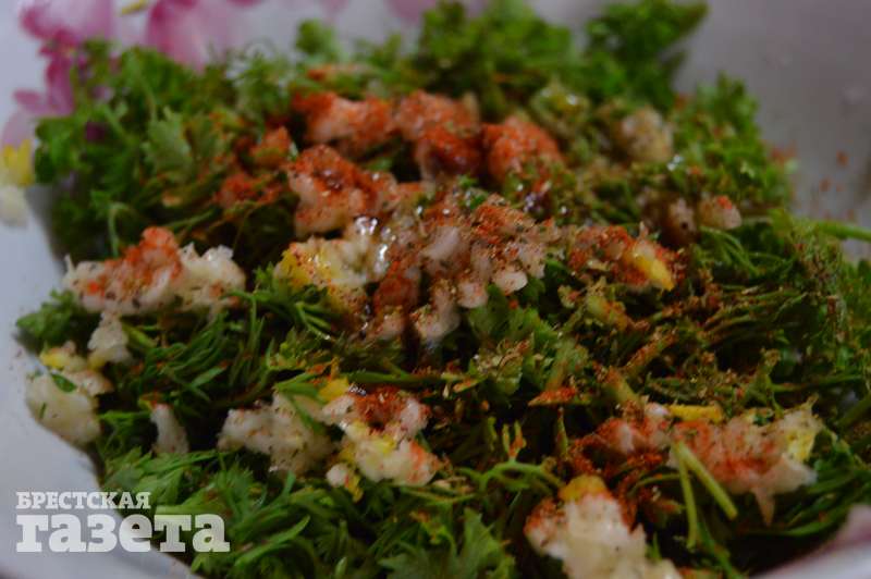 Зелень измельчите, добавьте 4 ст. л. масла, чеснок, соль и перец. Полейте заправкой рататуй, накройте фольгой и запекайте в духовке час при 180 градусах.