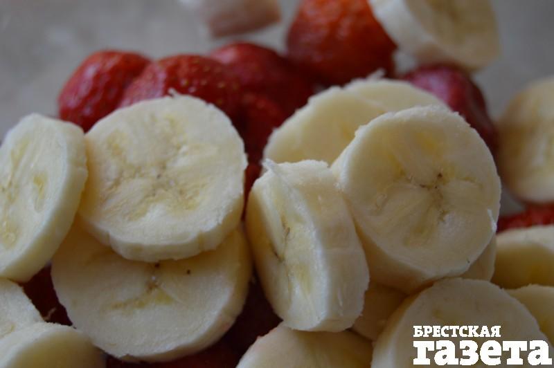 Готовим: Клубнику помойте и очистите от плодоножек. Банан нарежьте кружочками. Положите ягоды и фрукты в миску.