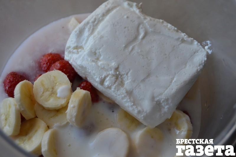 Надо: 180 г нежирного творога, 150 мл кефира, 50 мл минеральной воды, 150 г клубники (свежей или замороженной), 1 банан, орехи, изюм по вкусу.