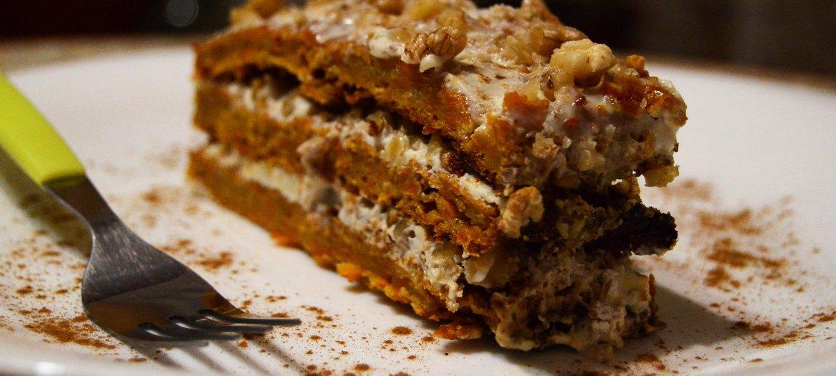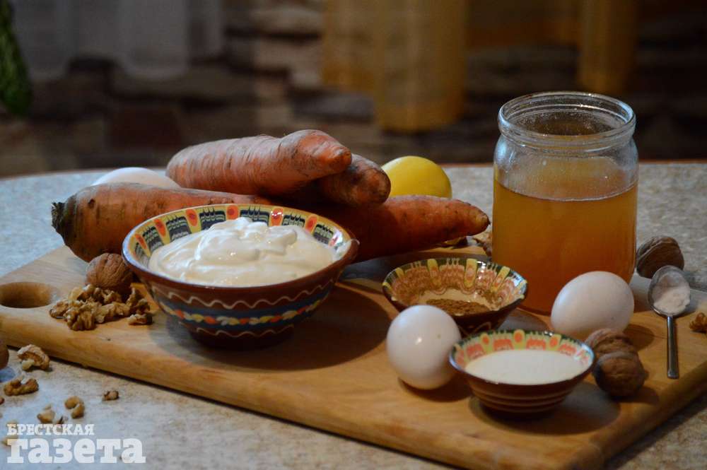 Испеченный корж разделите на три части. Каждую промажьте творожным кремом (творог, смешанный с медом) и посыпьте орешками, выкладывая друг на друга коржи слоями.