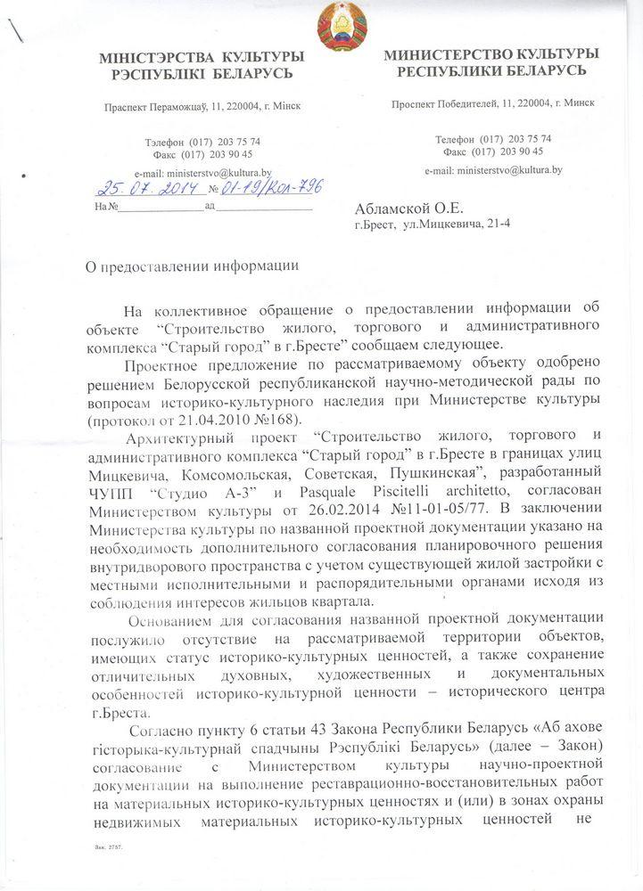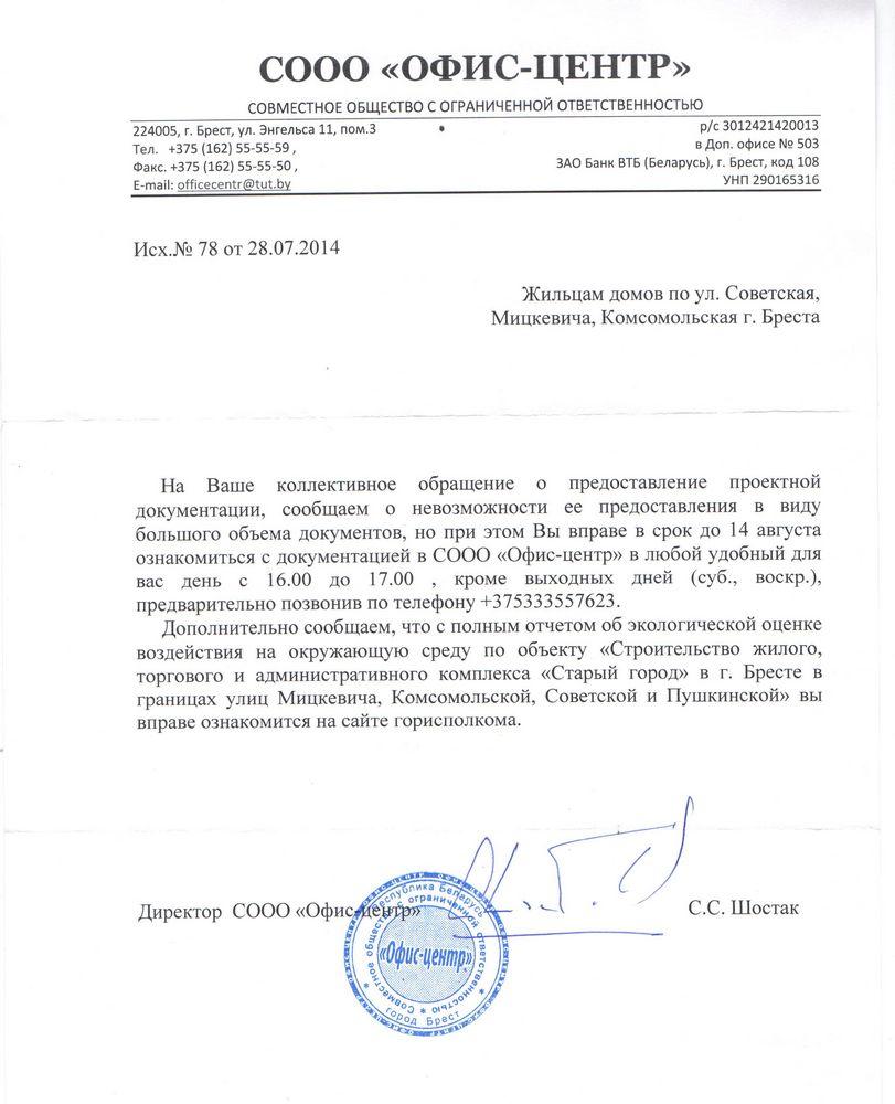 Корреспондентом была предпринята попытка узнать, почему до сих пор нет ответа на коллективное письмо брестчан, выступающих против строительства комплекса «Старый город». Однако начальник отдела по работе с обращениями граждан и юридических лиц горисполкома Ирина Мокат решительно заявила: «Вы являетесь одним из заявителей? Нет? Значит, по закону об обращениях граждан я вам ответ на ваш вопрос дать не могу. Я понимаю, были бы вы заявителем. Тогда по предъявлении паспорта — пожалуйста».