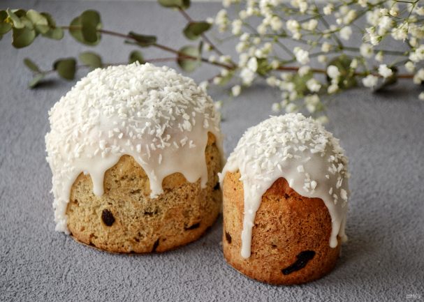 Поставьте кулич в теплое место на еще час — полтора. Затем выпекайте 20 — 30 минут при температуре 180 градусов. Украсьте по желанию кокосовой стружкой или кокосовой глазурью.