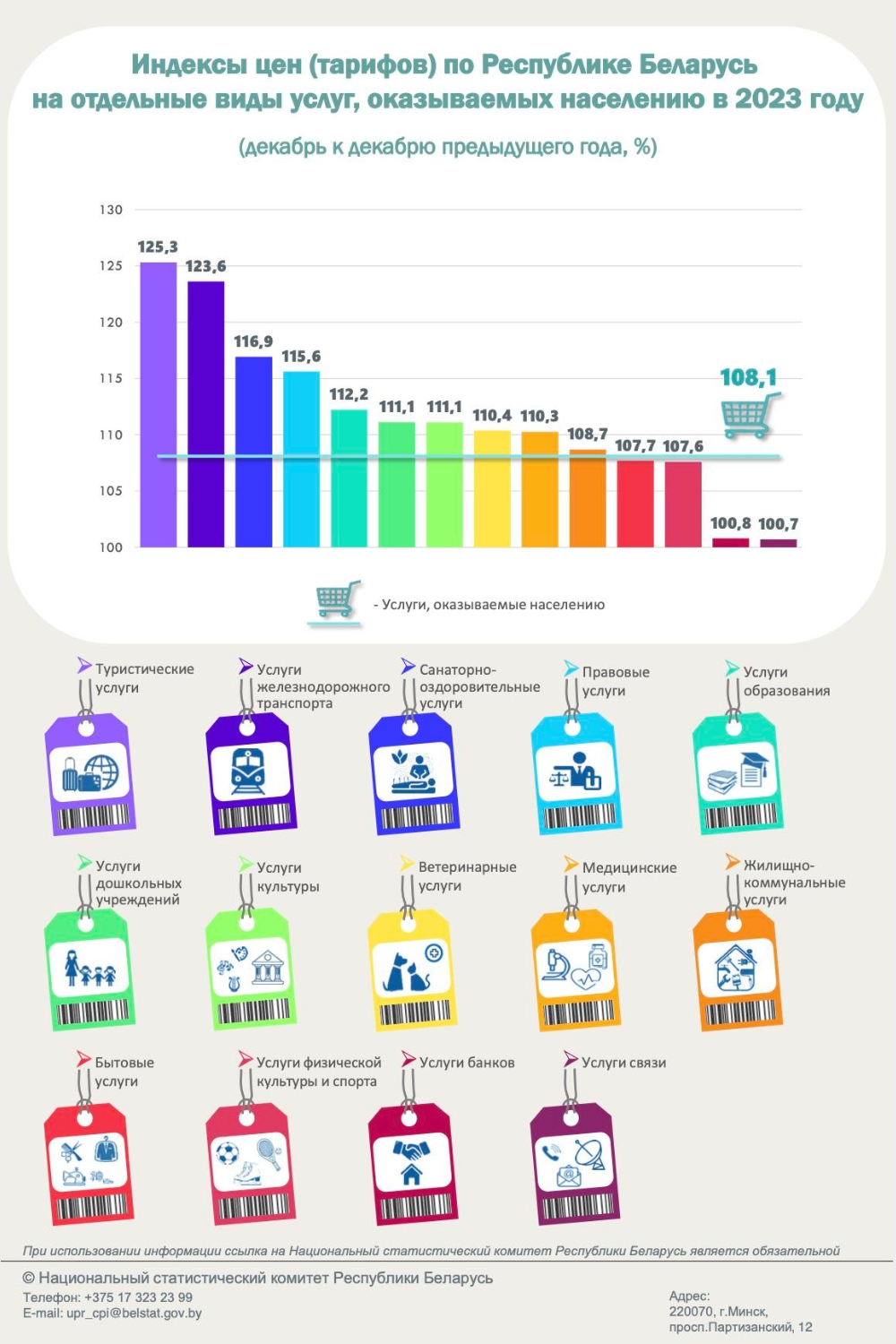 Среди услуг заметно подорожали туристические услуги (+25,3%), услуги железнодорожного транспорта (+23,6%), санаторно-оздоровительные услуги (+16,9%).