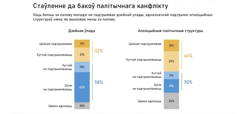 - По соотношению знаний и доверия среди молодежи лидируют практически только противники действующей власти. Политические организации: Офис Светланы Тихановской, Полк Калиновский, Киберпартизаны и ByPol. Политики: Светлана Тихановская, Виктор Бабарико, Мария Колесникова, Павел Латушка и Александр Лукашенко.