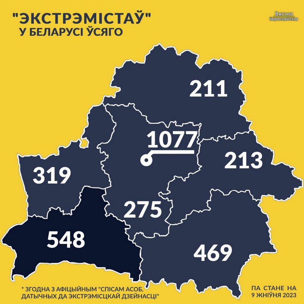 На 9 августа 2023 года в «список экстремистов» внесли 3 111 человек. 548 человек из них относятся к Брестской области. На душу населения, после столицы, в нашем регионе самый высокий показатель «экстремистов» — репрессированных в уголовном порядке.