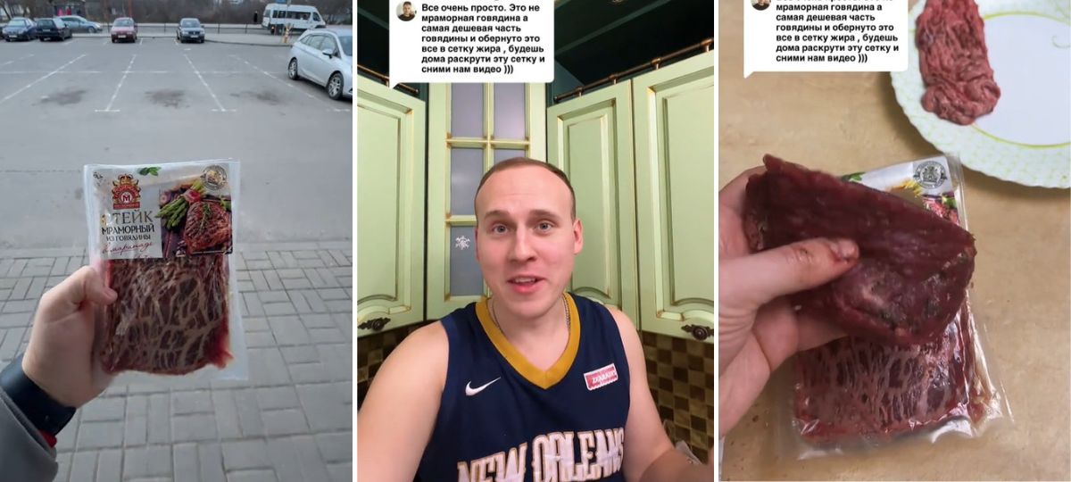 Видео о «мраморном» стейке из говядины Ольшевский опубликовал в TikTok 4 февраля. В руках он держал «стейк мраморный из говядины в маринаде» от Гродненского мясокомбината. На упаковке надпись «элитный продукт».