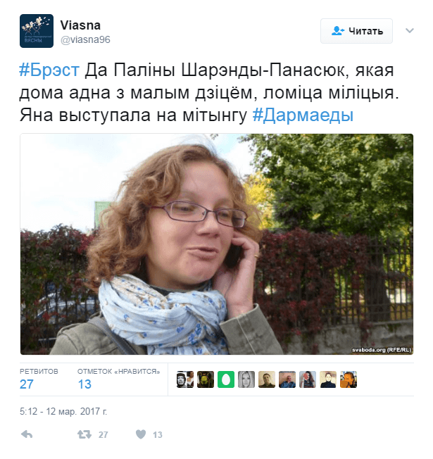 Жена Андрея Шарендо Полина пришла на площадь. Его самого «сторожат» дома. Напомним, за участие в акции 26 февраля Андрея оштрафовали на 25 базовых.