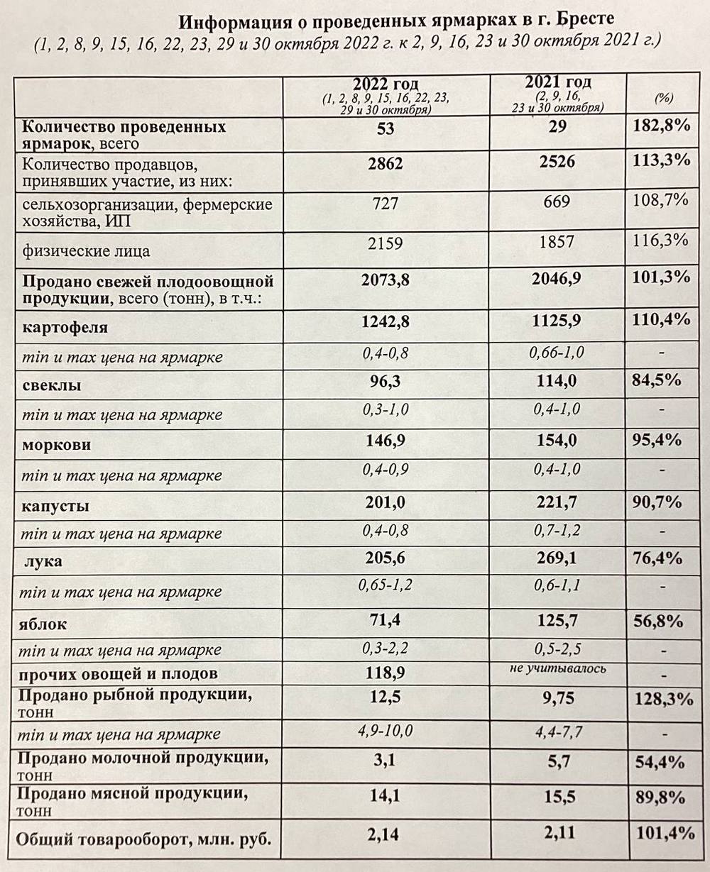 Председатель Брестского горисполкома Александр Рогачук опубликовал статистику по проведенным в этом году в Бресте сельскохозяйственным ярмаркам.