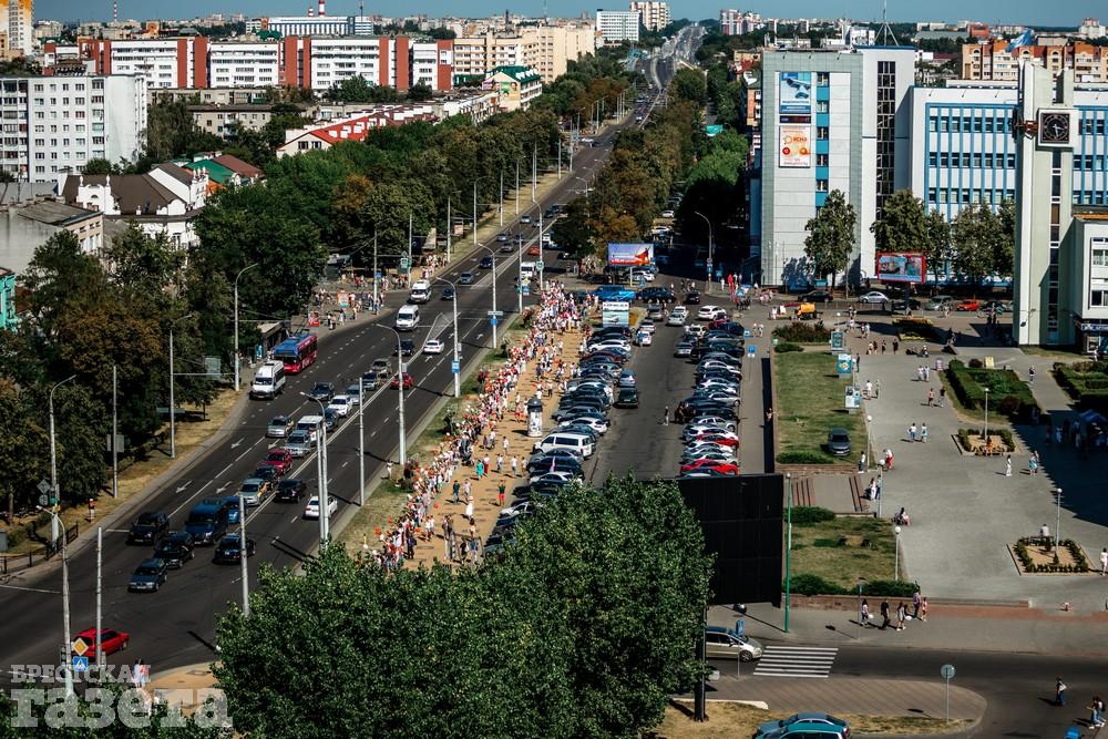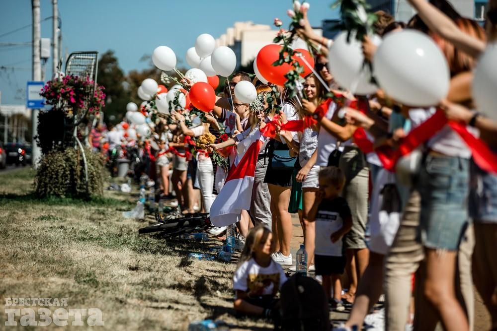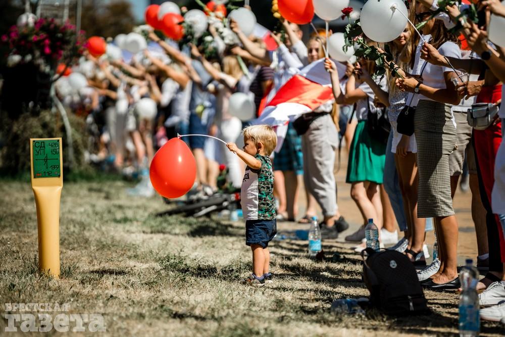 В живой цепи стояла и сильная половина, у некоторых мужчин были большие бело-красно-белые флаги.