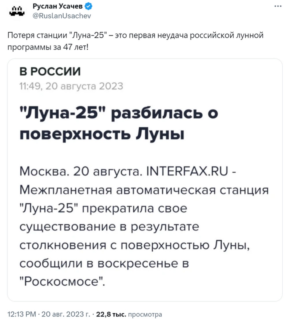 Россиян потролили, что в лучших пропагандистских традициях в РФ было больше разговоров о миссии межпланетной станции «Луна-25». Однако на самом деле Россия не смогла показать ничего толкового и в очередной раз опозорилась.