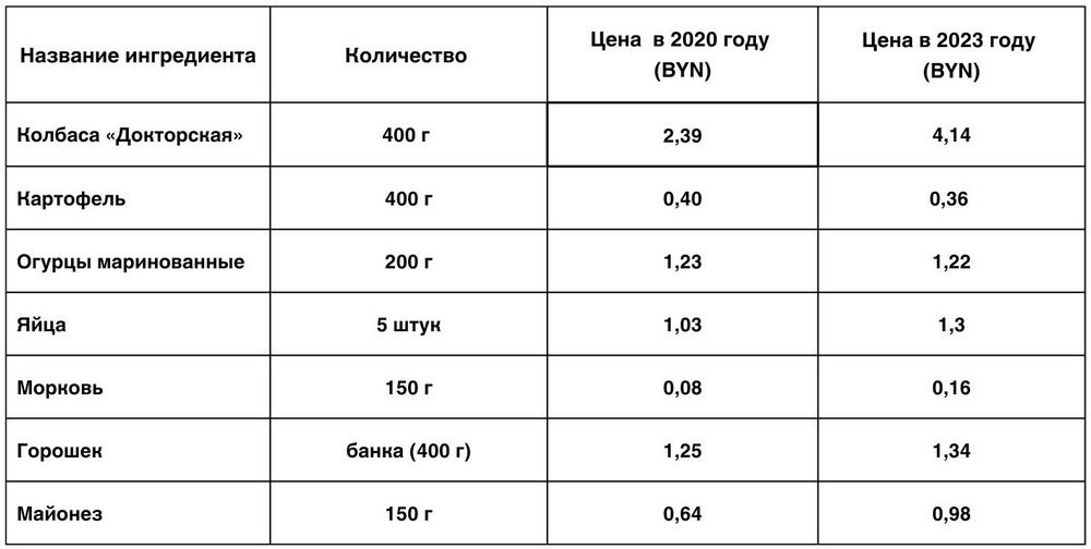 Для удобства и наглядности мы составили сравнительную таблицу цен на ингредиенты салата «Оливье» за 2020 и 2023 годы.