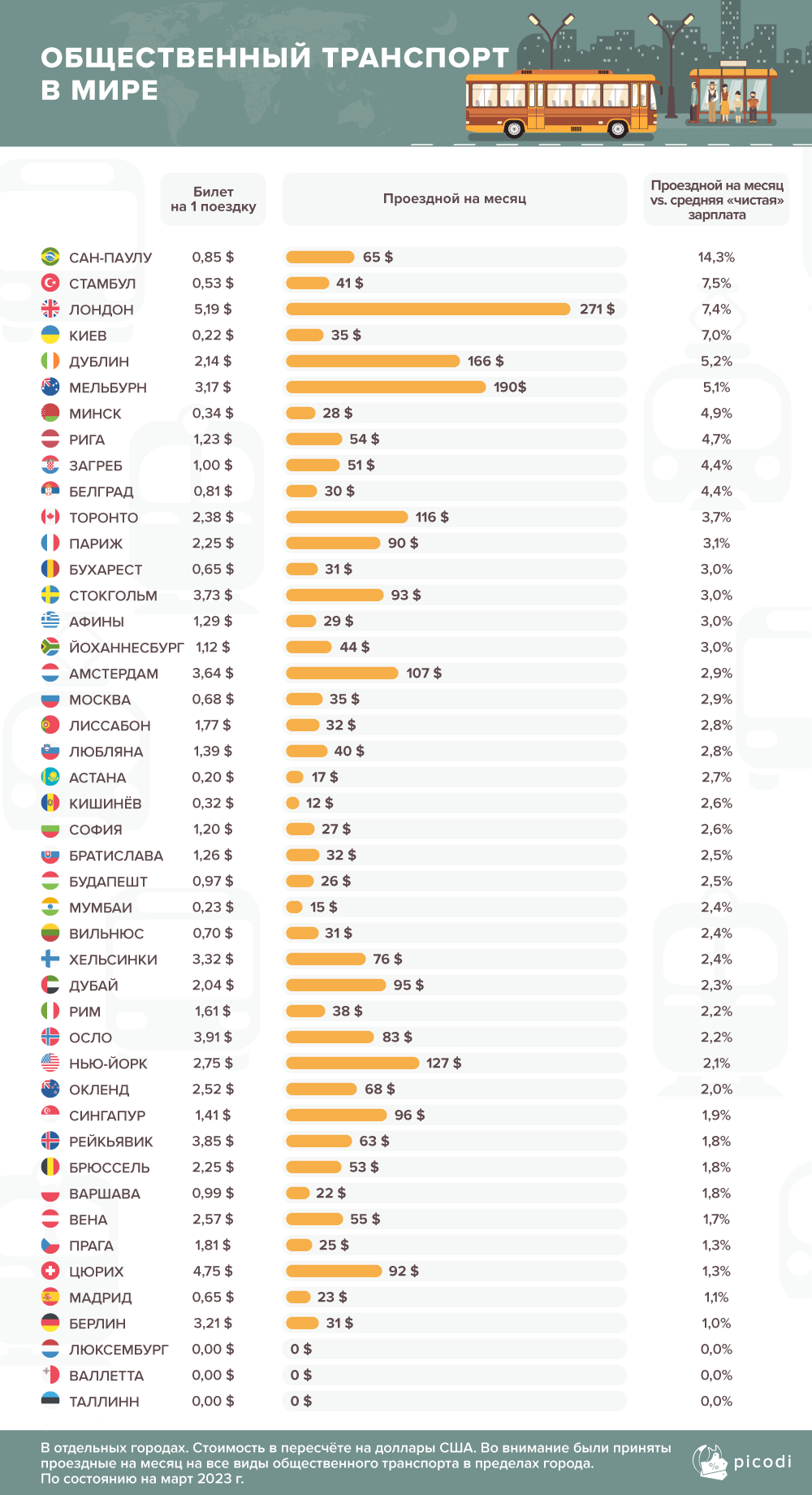 Команда Picodi.com изучила стоимость билетов на общественный транспорт в 45 крупных городах мира и сопоставила эти расходы с чистой средней заработной платой. Для исследования издание взяло стоимость проездных билетов на 1 поездку и на 1 месяц, которые позволяют пользоваться общественным транспортом в пределах города без ограничений.