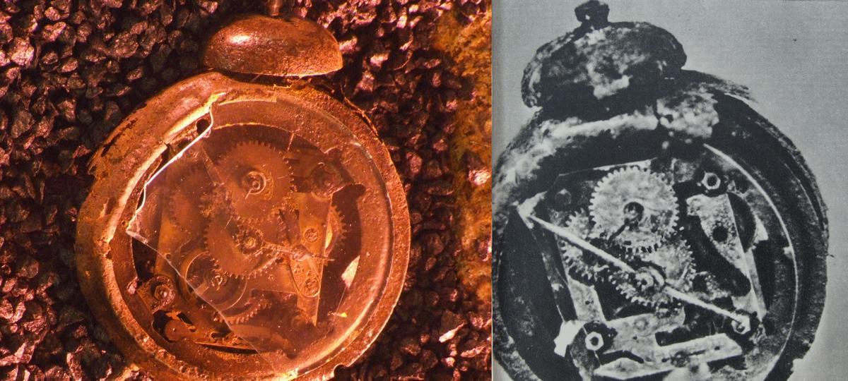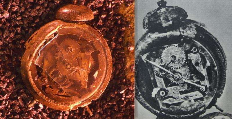 Если посмотреть на наш будильник внимательнее, то можно заметить, что его стрелки показывают не ровно четыре. Минутная стрелка остановилась примерно на без четырех или без пяти, угол между стрелками составляет около 135 градусов. Видимо, чтобы посетители не слишком присматривались, в первой постоянной экспозиции рядом расположили стилизованные (и значительно бóльшие по размеру) часы, точно показывавшие «правильное» время. Так будильник смог «засвидетельствовать» момент времени, который он не показывал. Видимо, по чьей-то невнимательности в 1973 г. был опубликован более ранний снимок будильника, который служит доказательством фальсификации: минутная стрелка на фотографии стоит примерно на цифре 10, обе стрелки образуют почти прямую линию. Публикация осталась без последствий, потому что поначалу никто не заметил разницы. Итак, мнимый свидетель «первых бомб, упавших на крепость», остановился еще за 25 минут до первых взрывов (и это не были взрывы авиабомб, бомбардировки начались лишь спустя восемь дней), а, может быть, и в какой-то другой день в 03.50 или 15.50.