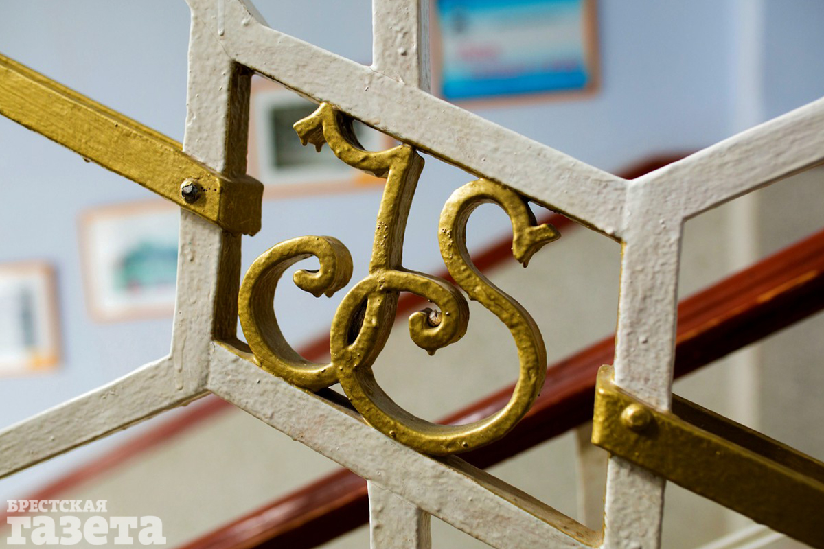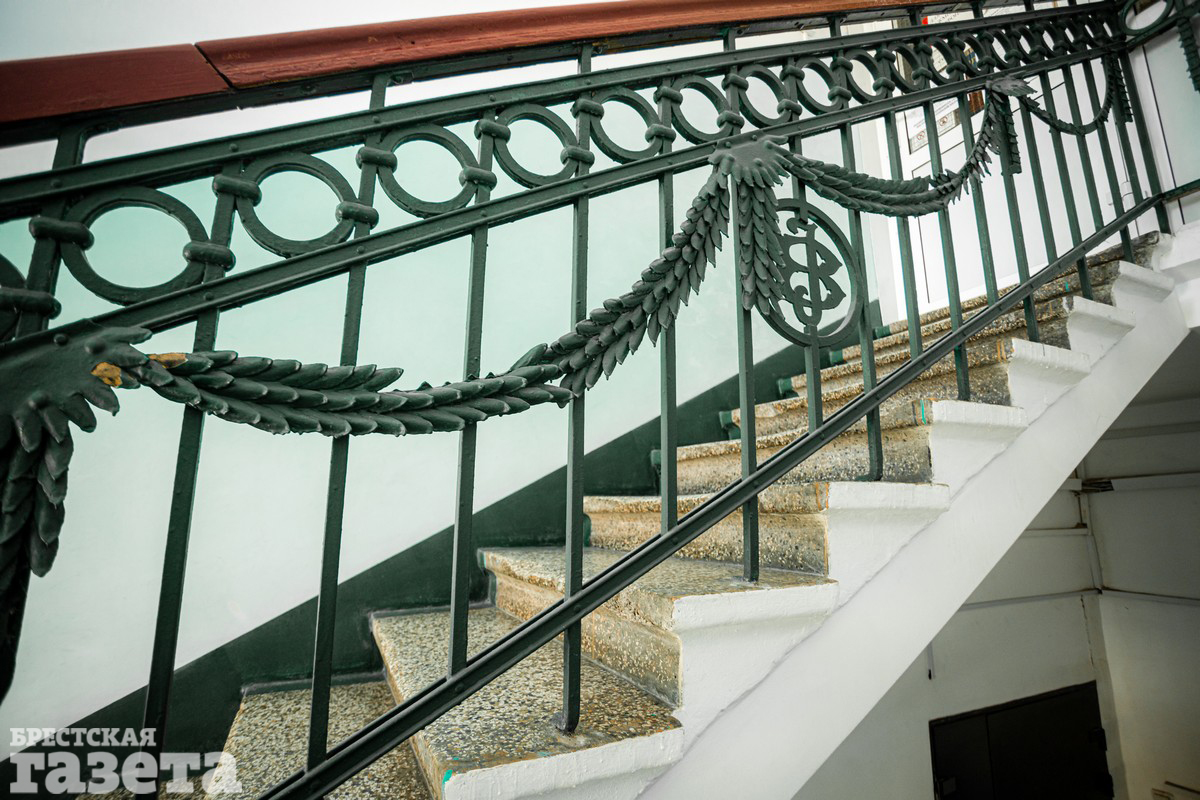 В подъезде по адресу Советская, 55 мы видим сразу двух свидетелей далекого прошлого: изящные украшения на лестнице в виде гирлянд из лавра с вензелем BJ (возможно, инициалы хозяев дома или сокращение от названия фирмы-изготовителя) и ступени из мраморной крошки.