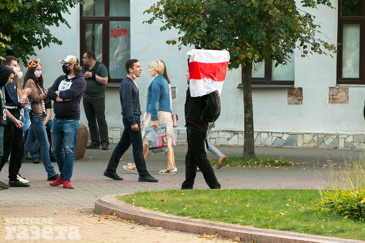 Один из демонстрантов порвал официальный флаг Беларуси.