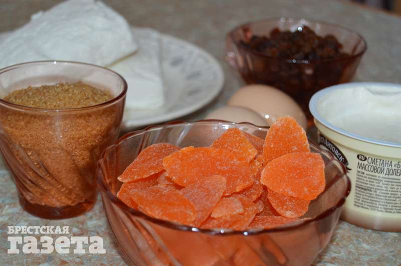 Надо: 350 г творога 9% жирности, 150 г жирной сметаны (от 20%), 2 сырых яичных желтка, 100 г сахара, 2 г ванилина, 100 г изюма, 100 г цукатов.