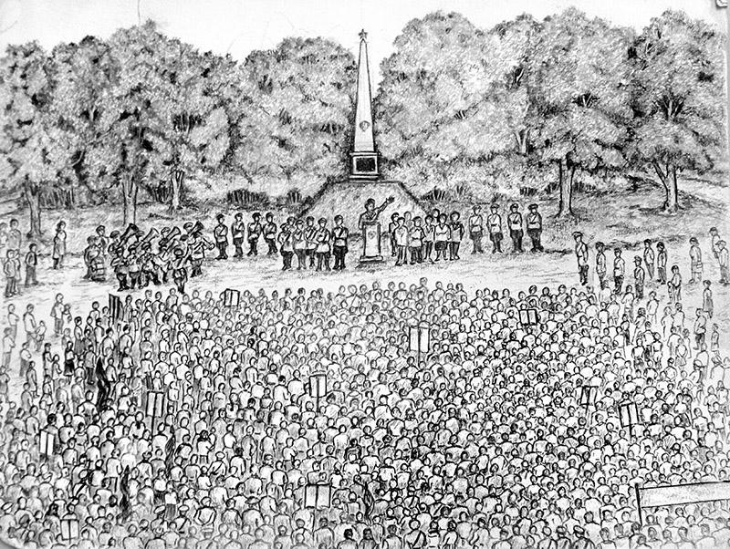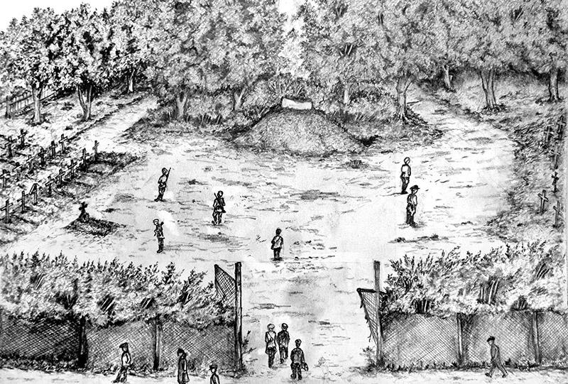 На следующем рисунке он изобразил то же место, как оно выглядело при немцах в 1941 — 1944 годах. Стелу убрали, постамент оставили. Справа и слева располагались захоронения немецких солдат.