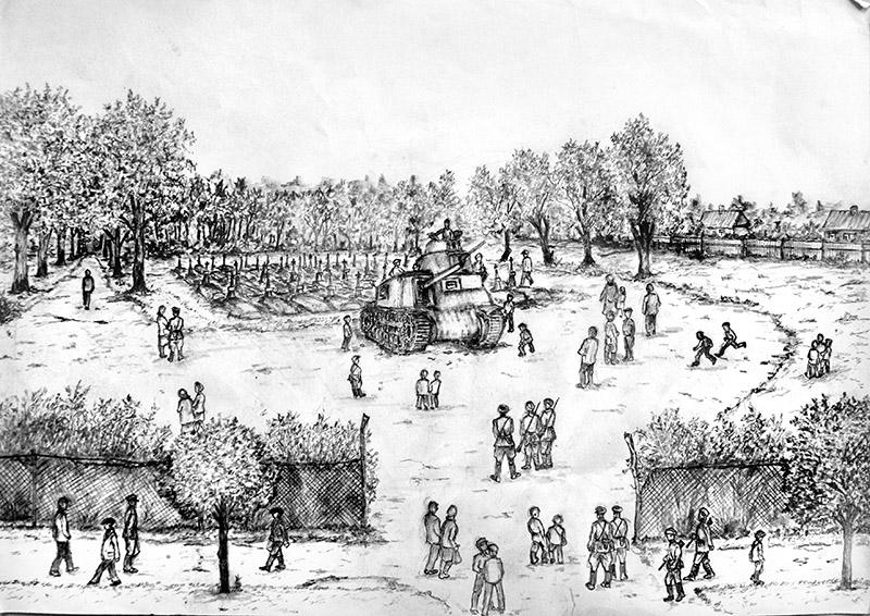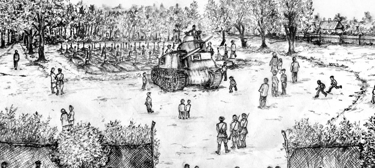 Август 1944 года. После освобождения Бреста немецкие могилы убрали, вспомнил художник. По центру начали хоронить советских солдат, которые умерли в госпиталях и погибли в Польше. Перед захоронениями стоял американский танк М-3, такую технику поставляли в советскую армию по ленд-лизу (система передачи США взаймы или в аренду вооружения, боеприпасов, стратегического сырья, продовольствия, товаров и услуг странам-союзникам. Закон о ленд-лизе приняли в США в 1941 году).