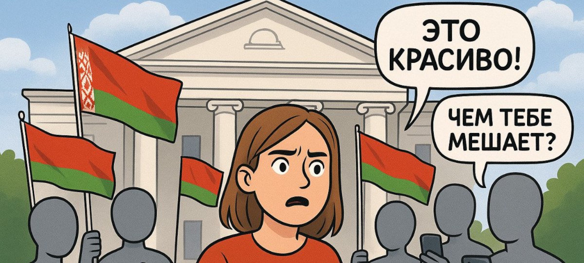 Жительница Гомеля заметила, что колонны драматического театра почти полностью закрыты красно-зелеными флагами с яблоневым цветом. Она задала в TikTok, казалось бы, безобидный вопрос: «А вы не знаете, когда закончится День Победы и другие праздники, чтобы снять весенние цветочки и вернуть колоннам первоначальный классический вид?». Но безобидный вопрос вызвал бурю. Видео собрало сотни комментариев — и большинство из них от «патриотов», уверенных, что подобные слова чуть ли не подрыв основ государства. Они писали, что «это же красиво» и называли автора «внучкой полицая».