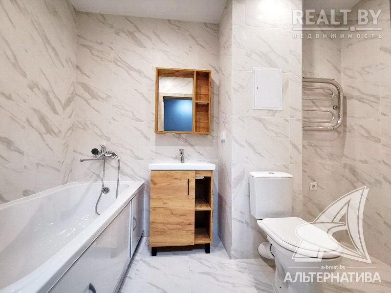 В квартире поставлены стеклопакеты. Межкомнатные двери – экошпон. Потолки – натяжные, на полу – ламинат, стены оклеены обоями, в санузле лежит современная плитка.